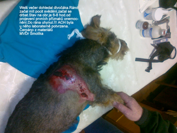 Buďte proto při dosledu černé zvěře a naháňkách opatrní, snažte se o co nejmenší styk Vašeho psa s divočákem, hlavně jej nenechte lízat barvu, ryj a nedávejte jim za odměnu syrové kousky masa a vnitřností. Více informací o ACH je na internetu Wikipedie Aujeszkyho choroba.